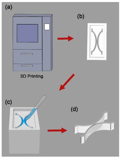 Schematic for X-shaped actuator fabrication: (a) the designed mold was fabricated with a 3D printer, (b) the mold was printed, (c) the silicone mixture was poured into the mold and solidified, and (d) the X-shaped silicone fabrication was completed.