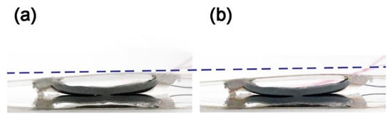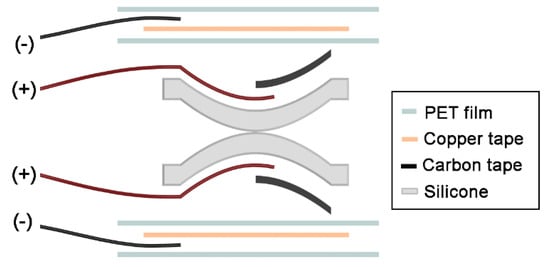 A 2.5 cm × 1 cm carbon conductive adhesive tape (Nisshin EM Co., Ltd., Tokyo, Japan) was attached to the right half of the curved surfaces of silicone with wires (Figure 3). Polyethylene terephthalate (PET) film (Saehan, Paju, Korea) and a copper tape (1181, 3M, Saint Paul, MN, USA) was cut into sizes of 7 cm × 2 cm and 5 cm × 1 cm, respectively. Then, the top and bottom of the copper tape were covered with two PET films. We connected wires to supply input voltage to the copper tapes. Two of these copper tapes with PET films were attached to the top and bottom of the X-shaped silicone.
