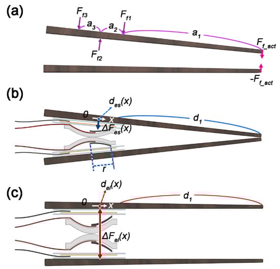 In our case, the chopstick robot is operated by electrostatic forces (ΔFes(x)) at certain distances (des(x)) of the X-shaped actuator (Figure 5b). In the switched-off state, the elastic force (ΔFel(x)) at the distances (del(x)), based on the structure and material characteristics of the robot, is used for the recovery of the X-shaped actuator (Figure 5c). Note that des(x) and del(x) denote the distance from the tip of the chopstick to the point at which the elastic force and elasticity act, respectively. The lengths up to each point of the force can be expressed as follows: