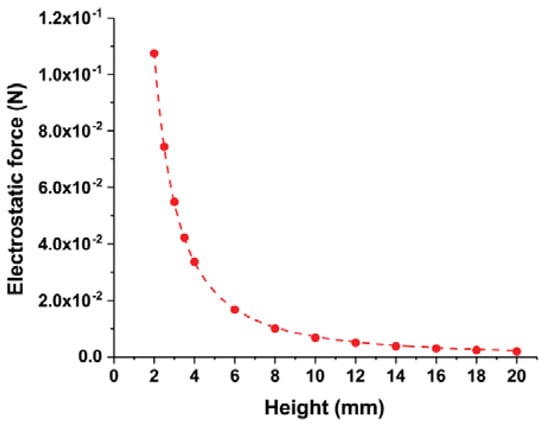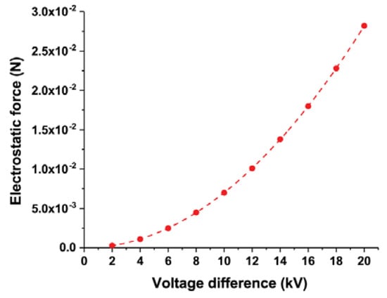 We can calculate the total electrostatic force by substituting the parameters given in Table 1 into Equation (7). The result is 1.01 × 10−2 N.