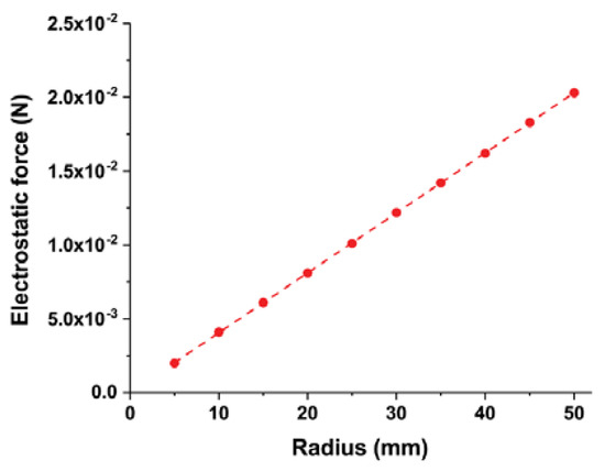 Further, the radius of the X-shaped actuator is proportional to the electrostatic force (Figure 8). When the radius of the X-shaped actuator is reduced by 1 cm, the electrostatic force is reduced by approximately 60.4%. On the other hand, doubling the radius of an X-shaped actuator doubles the electrostatic force.