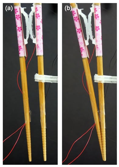 Photographs of moving chopsticks: (a) when the tips of the chopsticks are opened, and (b) when they are closed.