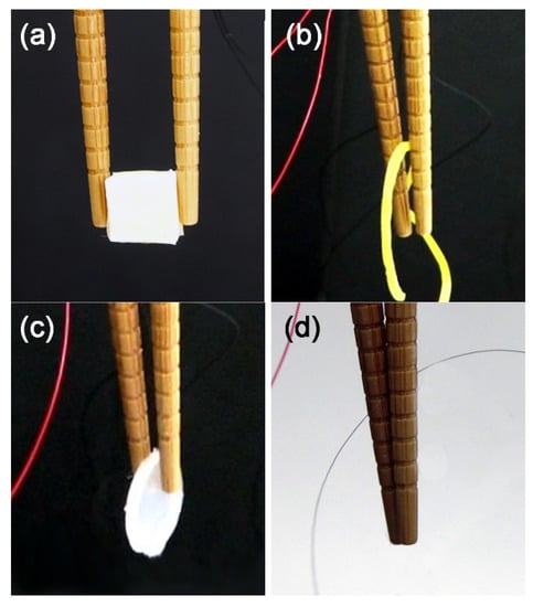 We tested the chopstick robot by attempting to hold various objects (Supplementary Video S1). The robot grasped a 10 mm × 10 mm × 10 mm cube made of paper (Figure 11a). In addition, the robot successfully grasped a rubber band and a silicone plate, with a radius of 10 mm and a thickness of 2 mm, respectively (Figure 11b,c). The chopstick robot holds an object while the power is turned on, and immediately drops it when the power is turned off. It could also pick up a strand of hair (Figure 11d). Moreover, we have carried out hundreds of repeated experiments and the chopstick robot performed well repetitively, without any structural modifications or problems.