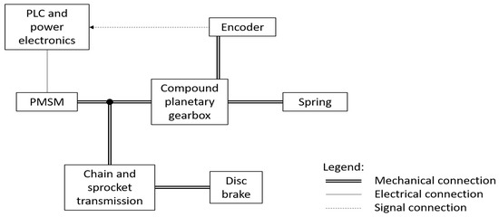 Given the mechanical properties of the polymeric materials employed for the reduction gearbox, only a low torque can be transmitted. Conversely, the internal friction torques depend primarily on the geometrical size of the gearbox. For this reason, the motor needs to be largely oversized in terms of stall torque. This allows us to keep an acceptable ratio between the stall torque of the motor and the internal friction of the transmission. However, loads applied downstream of the gearbox (and compatible with its strength) are not able to produce a significant effect on the motor operation. Then, to simulate loads of different magnitude, we decided to split the torque paths as shown in Figure 1. External torques intended to load the motor (for example to measure variations in motor current) are applied a by disc brake and transmitted directly to the motor shaft by a chain and sprocket transmission, bypassing the FDM gearbox. Torques intended to load the gearbox (for example, to measure deformations or variations in efficiency) are applied to the output shaft by a spring. In order to model the behavior of this particular transmission, the efficiency of the two torque paths shall be evaluated. The chain and sprocket used for the brake has a gear ratio of about 1.5, and its efficiency can be assumed close to unit; the main losses here can be ascribed to the bearings supporting the output shaft. As regards the planetary gearbox, its efficiency will be measured in a preliminary experimental campaign and compared with a numerical model [23].