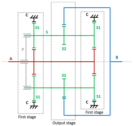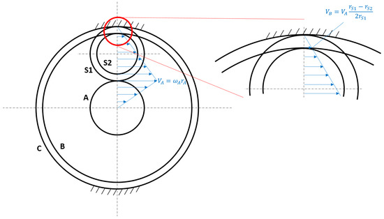 Being , the translation speed of the second stage satellite does not match its peripheral speed. Then, the second stage ring gear B is dragged with a peripheral speed , equal to the residual between the translation and peripheral speed of the satellite (Figure 3). The first planetary stage is mirrored on the opposite side of the output stage in order to balance the forces acting on the satellites. This way, the planet carrier is not needed, since no torque or forces are applied to it [22,24]. The use of rolling rings in parallel of the gears, matching in diameter the primitive circle of the respective wheels, allows us to support radial loads [22], as shown in Figure 4.
