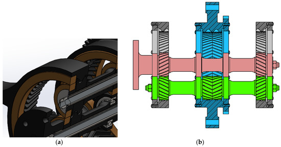 (a) Detail of the metal rolling rings employed to support radial loads; (b) partial cross-section of the gearbox, highlighting the herringbone and helical teeth. Note that the spacers between the stages are intended only to ease the installation of sensors on the EMA test bench; a production version would not need them and would have about half the axial length.