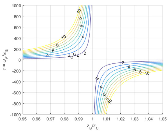 where Ω is the angular velocity of the planet carrier. Similarly, the transmission ratio between the input A and the ring gears C is: