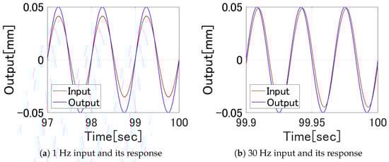 It is natural to infer that the bimorph piezoelectric actuator exhibits structural oscillation property, as its mechanical structure can be regarded as a thin cantilever. The mechanical resonance of the target actuator exists at around 70 Hz, as shown in Figure 4. We can also observe the difference in the amplitude of the actuator responses to 1 and 30 Hz inputs in Figure 5. It shows that the 30 Hz output exhibits phase lag to the input, whereas the 1 Hz output does not. Additional observations of the frequency responses of the actuator motivates the introduction of the infinite impulse response (IIR) filter structure between the input and the output that results in the algebraic structure of the model determined by