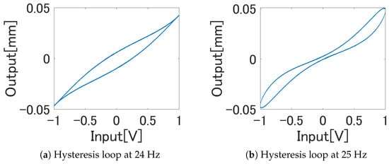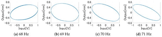 We empirically understand that the odd harmonic response will be large enough to distort the hysteresis loop when the odd multiple of the input frequency matches the mechanical resonance of the actuator; the results of frequency analysis of actuator responses summarized in Figure 8 supported our thoughts. It is true that the odd harmonic responses might be observed in all excitation frequencies, as illustrated in Figure 8b. Whether the odd harmonic component could be large enough to affect the output, depends on the matching between the odd multiple of the input frequency and the resonance frequency.