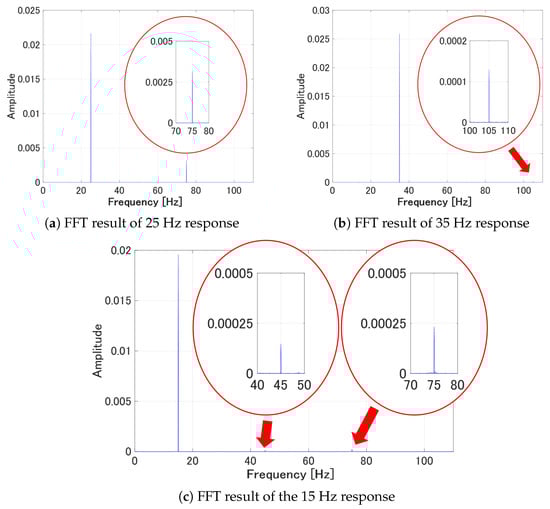 It is clear from the figure that this is intrinsically different from the pure sinusoidal signal. Empirically speaking, we have to expect different identified values of , and when they were identified with a signal different from a 25 Hz pure sinusoid. We have to conclude accordingly that the parameters , and identified in the experiment as we detailed in Section 5.2 are no longer valid to cancel out the source of odd-harmonics. There can be cases where the odd-harmonic oscillation is not attenuated but magnified in the present situation, which was evidenced by the FFT analysis shown in Figure 19.