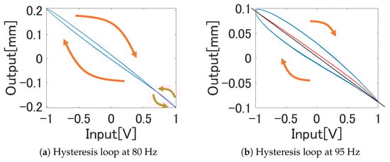 The hysteresis loop shown in Figure 9a is referred to as the interleaved hysteresis in which both clockwise and counterclockwise loops co-exist in a single hysteresis loop. The hysteresis loops observed at frequencies higher than the one which incurs the interleaved hysteresis typically look like the one shown in Figure 9b. It is a clockwise loop, which is highly asymmetric about the origin of the input/output plane. The black line in the plot connects the outputs corresponding to the positive and the negative peaks of the input, whereas the orange curve goes through the middle points of the actuator outputs corresponding to the same input value.