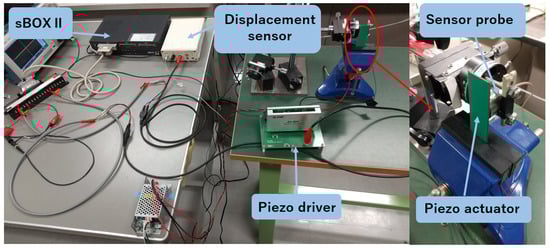 The experimental apparatus used in this study is shown in Figure 12. The piezoelectric actuator is controlled in real-time by a digital signal processor system with embedded peripherals (sBOX II, MIS Co., Tokyo, Japan). The piezo driver (As-904-150B, NF Co., Yokohama, Japan) receives the analog command voltage signal from sBOX which varies within V and amplifies it to maximally V to drive the actuator. One end of the actuator was clamped firmly as shown in Figure 12. When a sinusoidal input signal was fed to the piezo driver, the actuator bends left and right to exhibit swing oscillation. The displacement of the tip of the actuator is measured by the capacitance type displacement sensor (M-2213, MESS-TEK Co., Saitama, Japan) with the sensor probe (TRA2025-2K-V1, MESS-TEK Co., Saitama, Japan). The measurement resolution of this probe is specified to be 20 nm by the manufacturer. We have measured the tip displacement because the largest displacement can be expected at the tip in our driving frequency range and high signal to noise measurement during the experiment can be expected.