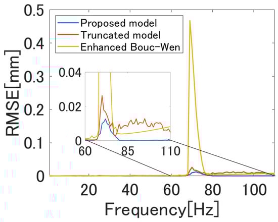 The RMSE metrics of the three models for the tested frequencies are summarized in Figure 13. It can be seen from the figure that the proposed model exhibited the smallest RMSEs for all 110 frequencies tested. Its advantage is relevant at frequencies higher or equal to the mechanical resonance frequencies, where remarkable changes on the actuator responses are observed. However, the RMSE indices of the proposed model increased significantly between 70 and 80 Hz, as the magnitude of the responses at these frequencies were comparably larger than the others.