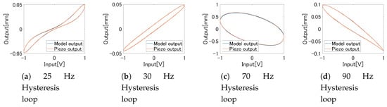However, four hysteresis loops around the resonance frequency, as shown in Figure 6 reveal that Equation (17) is not sufficient to capture the behavior. Four hysteresis loops shown in the figure are all counterclockwise. A drastic change in the phase characteristics of the actuator output is observed only over a 3 Hz increment of the input frequency. We introduced an additional term proposed by Song et al. [23] with their Preisach model to capture the change of characteristics observed in Figure 6. The output of our model at its current phase is described by