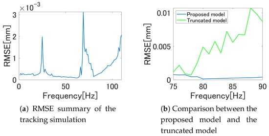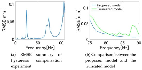 We calculated the root mean squared tracking error between the reference trajectory and the actuator response y. The simulation results of the hysteresis compensation are shown in Figure 16, whereas the experimentally obtained metrics are summarized in Figure 17. In both figures, the plot (a) covered all the tested frequency, whereas the plot (b) showed the comparison between the results with the proposed model (plotted with blue), and the results with the truncated model (plotted with green).