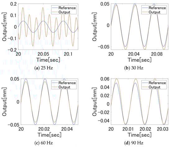 Further discussion is possible on the fail of attenuation of odd-harmonic oscillation. Equations (37) and (35) explain that the strategy to attenuate the odd-harmonic oscillation in our DIM controller is to cancel out the source of the odd-harmonic oscillation as characterized by the terms in Equation (35) including the parameters , and . Inside the DIM controller synthesized for 25 Hz reference motion, we used these four parameters identified with the 25 Hz pure sinusoidal input. When we do the compensation experiment, the signal which drives the piezoelectric actuator was the plotted in Figure 20.