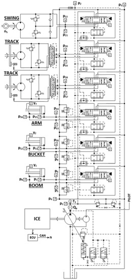 The 9-tonne hydraulic excavator in standard version is equipped with a 46 kW diesel engine (internal combustion engine (ICE)), the hydraulic circuit is a traditional Load sensing system, with a flow sharing directional valve and axial piston pumps. The attachment boom, arm, bucket and swing have been modelled. The ISO scheme of system layout of standard excavator, with the installed sensors for testing, is illustrated in Figure 1.