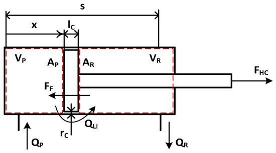 The hydraulic cylinders are double acting single-rod cylinders. The model is based on the scheme reported in Figure 2. The modelling approach considers the following assumptions: external cylinder leakages are neglected; the cylinder is considered rigid; to simplify the model the linear friction model includes the friction in in revolute pairs [37].