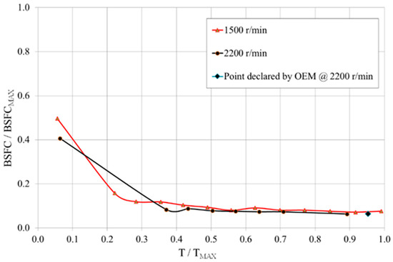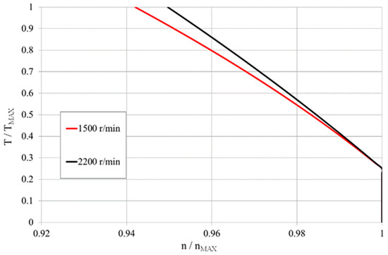 The ICE model developed calculates the instantaneous engine fuel consumption from an engine map as a function of torque and engine speed, as shown in Figure 3. The model includes the engine regulator behavior during operations, implementing the map reported in Figure 4, where the target rotational speed is reduced by a coefficient when the torque increases.