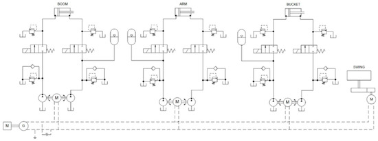 The strengthening of air-quality regulations and combustion engine emission limits in off-road mobile machinery has pushed researchers to investigate new energy saving solutions and efficiency improvement in general. Various research groups have already conducted investigations of the hybridization of architectures in order to improve the efficiency of the entire powertrain system or drivetrain. In this well-established area of research, the authors in [1,2] demonstrate the ways to improve the efficiency of hydraulic systems by the application of novel system solutions and the adaption of energy recovery. The most widely adapted approach is the harvesting of potential and/or kinetic energy. The harvesting of potential energy from the lowering boom motion or kinetic energy from the turning of the swing drive are state-of-the-art examples for excavator application (for details refer to [3,4,5,6]). Overall, the proposed approaches can be divided based on the utilized form of energy storage: electric (battery, supercapacitor, etc.) or hydraulic. The balance between the price of the utilized components and the efficiency becomes a key selection factor for any vehicle or off-road mobile machinery applications [7]. Due to the costs of the components, many researchers have turned to exploring the combination and improvement of all the systems and subsystems of the machine.