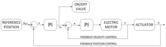 In the standard model, in order to reproduce the desired duty cycles, the actuator position is compared with the target position and a suitable spool position of the directional valve is defined. In the studied DDH solutions the position of the actuator depends on the delivered flow rates that are a function of the pump speed, this latter controlled by the electric motor. The required actuator position and the actual position define an error that is managed by a PI controller to set the electric motor speed, Figure 6.