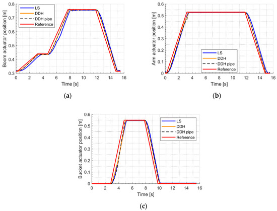 Actuator response to reference position of duty digging cycle: simulations results (a) boom, (b) arm, (c) bucket.