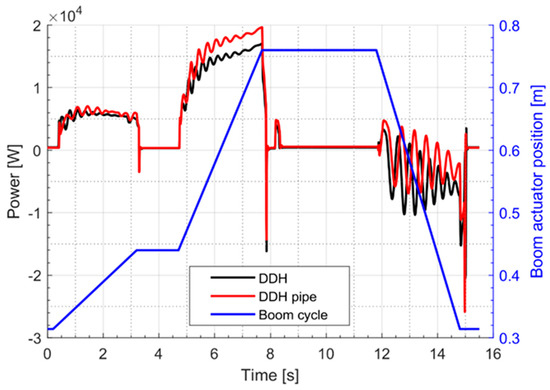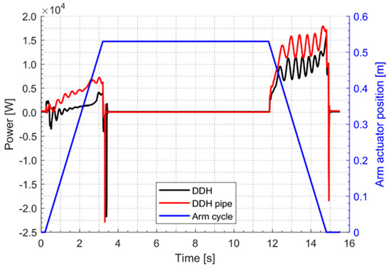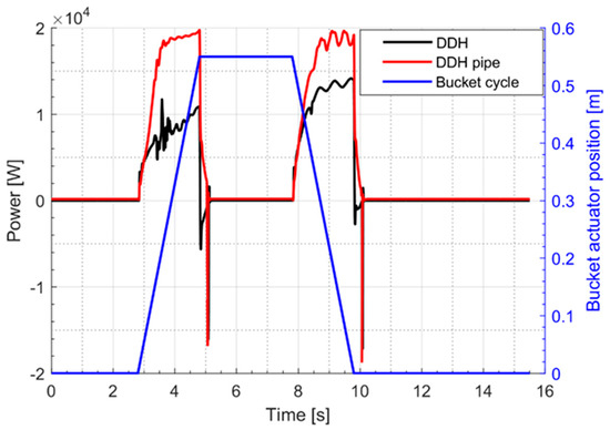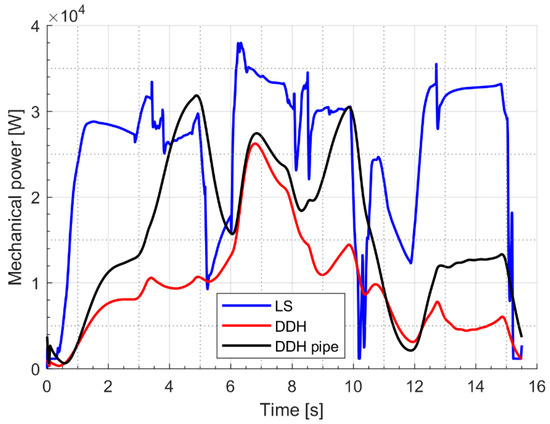 In Figure 9, the mechanical power required by the pump for the LS system and by the generator for DDH solutions is reported during a digging cycle. It is evident that the maximum mechanical power is always reduced in the case of DDH solutions; moreover, for DDH without pipes the power peak is limited to 26 kW instead of 37 kW. The lower power request will permit the investigation of a reduction of the diesel engine size.