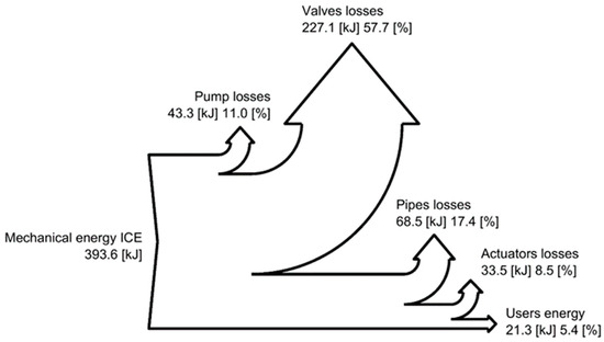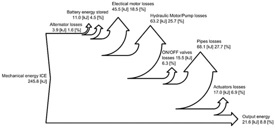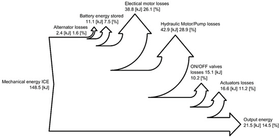In Figure 14, Figure 15 and Figure 16, the Sankey diagrams representing the energy distribution through the systems analyzed are reported; these diagrams allow the understanding of the losses distribution. In the standard configuration (Figure 14), the main losses are due to the valve block, while for the DDH solution with pipes (Figure 16)—the more efficient solution—the losses through the pipes become more relevant (27.7%) and similar to the losses generated by hydraulic motor/pump and electric machines.