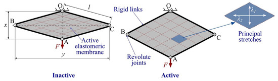The active membrane is mounted on the mechanism links with a certain degree of pre-stretch along the x and y directions, aimed at preventing loss of mechanical tension in the presence of electrostatic stress. Choosing a reference configuration such that and , we assume that the corresponding stretches in the x and y directions are known, and they are respectively equal to and , hereafter referred to as the pre-stretches. The principal stretches in the x and y directions in a generic configuration read as follows: