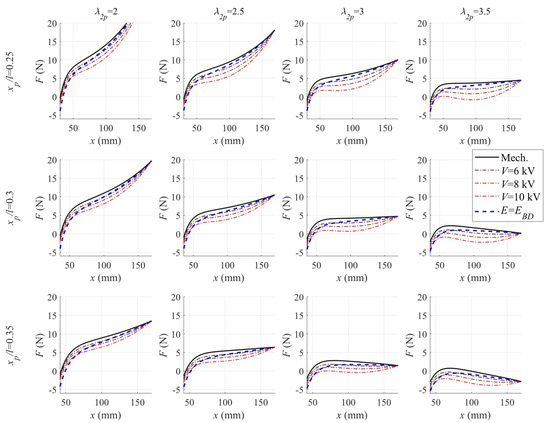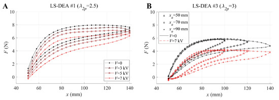 - In correspondence with the low values of and , the LS-DEA has a stiff response (i.e., large slope of the force-displacement curves). As a consequence, the force variation achievable through electric activation in a given configuration x is small compared to the bias mechanical force required to hold the actuator in such a configuration.