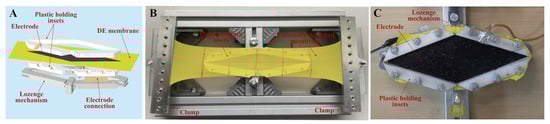 Assembly of the DE membrane on the lozenge mechanism was carried out by locking the mechanism in a selected pre-stretch configuration (identified by ), stretching the DE membrane uniaxially via rigid clamps (see [30]), and aligning it with the lozenge mechanism along the y direction. Different LS-DEA prototypes were built using DE membranes with different uniaxial pre-stretches. A picture of the pre-stretching operation is shown in Figure 3B, while a picture of the final LS-DEA assembly (with painted carbon grease electrodes) is in Figure 3C. The final assembled prototype had a mass of approximately 630 g, almost entirely ascribable to the lozenge mechanism and the holding frame.