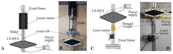 This section presents an LS-DEG prototype and a setup that were employed for the experimental demonstration and characterization of the proposed stiffness compensation principle illustrated in the previous sections. Different LS-DEA prototypes were developed by varying the DE membrane pre-stretches within the useful range identified in Section 3, so as to implement an intrinsic compensation of the DE membrane mechanical stiffness. The experimental setup was designed in order to make it possible to implement the following set of testing conditions: