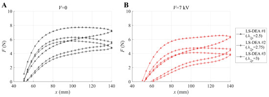 A comparison of the isopotential response of the different LS-DEA prototypes (featuring different pre-stretches) is shown in Figure 6, for the two cases with applied voltage equal to 0 (Figure 6A) and 7 kV (Figure 6B). In the considered range of values, increasing the transversal pre-stretch leads to a progressive reduction in the LS-DEA mechanical stiffness and, hence, a reduction in the LS-DEA restoring force. Interestingly, the different branches (loading-unloading) of the force-displacement responses have a monotonic increasing trend in the prototype LS-DEA #1 (featuring the lowest pre-stretch), whereas they show a decreasing trend (negative stiffness) at large values of x for the other two prototypes (with larger transversal pre-stretch). Such a negative stiffness response represents a potential benefit in applications in which the LS-DEA is coupled to stiff mechanical systems, but it might lead to instability issues in the presence of highly variable or randomly applied loads.