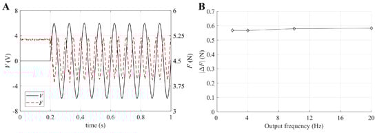 (A) Time series of the applied voltage and measured force for a test with excitation frequency of 10 Hz (output frequency of 20 Hz) and (B) electrically-induced force variation at different output frequencies for LS-DEA #3 () at blocking position mm.