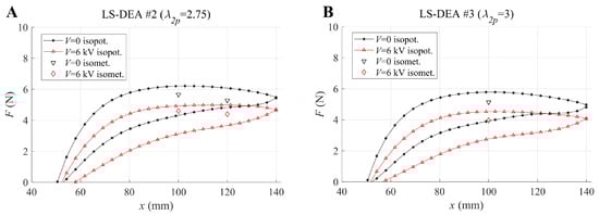 The results obtained in the isometric tests can be compared with those from isopotential tests. Figure 8 shows the isopotential curves at and kV and the experimental measurements (at the same voltages) obtained in the isometric tests, for prototypes LS-DEA #2 (Figure 8A) and LS-DEA #3 (Figure 8B), respectively. In the plots, the isometric forces in the electrically active state were calculated as the average over the different testing frequencies, due to the low variability of the electrostatic force with the frequency.