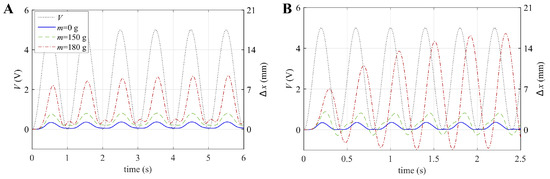 - At the lowest frequency (Figure 9A), the actuator operation can be considered quasi-static. As a consequence, the LS-DEA displacement was in phase with the electrical excitation. At the time instants where the voltage equaled zero, the device reached a position that approximately equaled the initial equilibrium position (i.e., ). The oscillation amplitude increased with the applied load (hung mass), owing to the lower stiffness of the LS-DEA at large applied forces (see the slope of the curves in Figure 6)