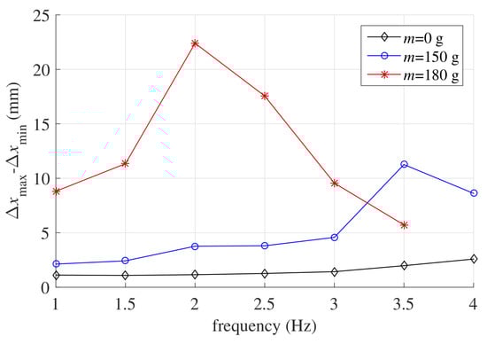 Crest-to-trough oscillation amplitude at different excitation frequencies in isotonic tests with different values of the hung mass.