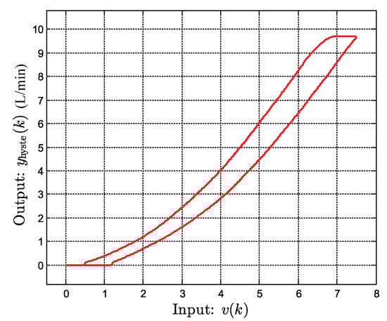We conducted experiments on the EHVS actuated by a proportional control valve, as shown in Figure 2, to measure the output data when applying a triangle wave voltage input of frequency and amplitude for with sampling interval . The specifications of the experimental EHVS are listed in Table 1. Figure 3 shows the complex nonlinearities in the EHVS input–output characteristics, which indicate an asymmetric hysteresis with dead zone and output saturation between the input and measured output .