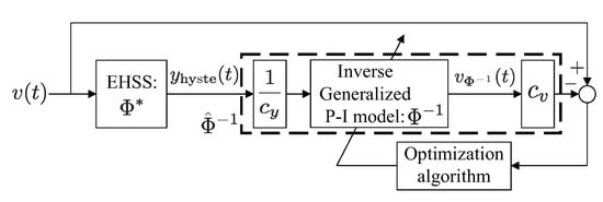 Let denote the real nonlinear behavior in Figure 3 of the EHVS in Figure 2. The unknown parameters of inverse generalized P–I model in (1) and (2) are directly estimated using the identification method in Reference [10]. Figure 4 illustrates the schematic diagram in our identification procedure for direct construction of . For identifying inverse model of the EHVS, the envelope, threshold, and density functions are given by