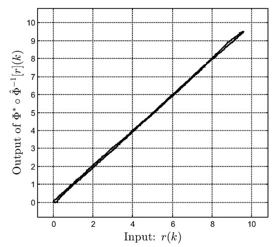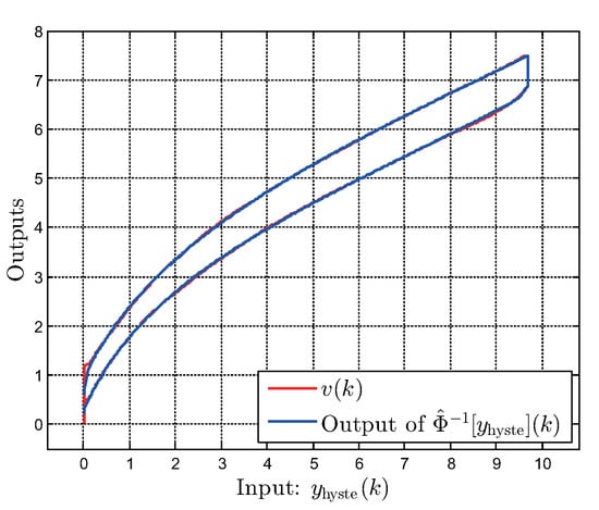 The relation of input into the identified inverse model and the resulting output of (i.e., inverse hysteresis loop) is shown in Figure 5, where inverse model is given by (1) and (2) with estimated design parameters given in (7)–(10). We implement the identified inverse generalized P–I model, , as the feedforward controller shown in Figure 1 and verify the precision of the estimated model parameters. Figure 6 shows the compensation results when applying triangle wave input with frequency of and amplitude of to the EHVS compensated by (i.e., ).