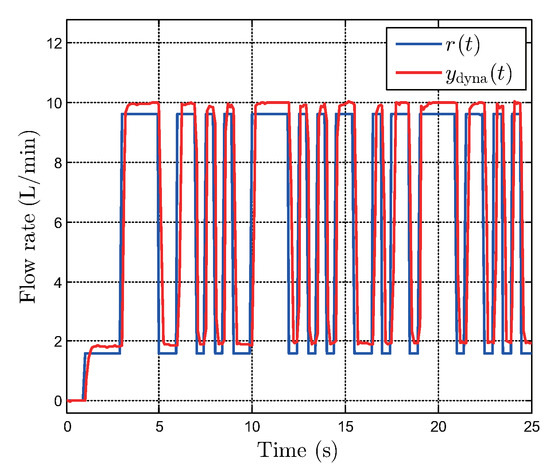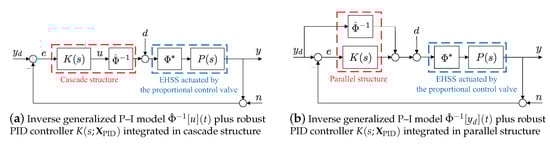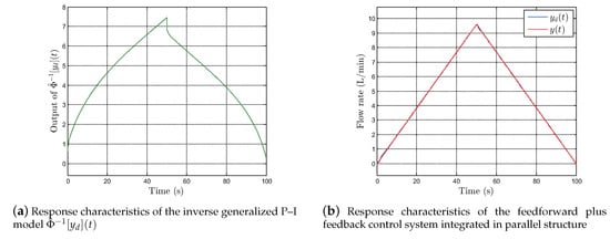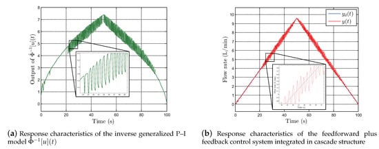 The inverse generalized P–I model as the feedforward controller and robust PID controller as the feedback controller can be integrated in cascade or parallel configuration, as shown in Figure 14 (see Remark 1 for details.). However, the feedforward plus feedback controller integrated in a cascade configuration, as shown in Figure 14a, cannot guarantee robustness against output noise. In fact, chatter is inevitable in cascaded control because the right and left envelope functions of the inverse generalized P–I model, which are dependent on the control signal contaminated by the output noise, can repeatedly switch by such noise in the EHVS. To demonstrate this problem experimentally, we applied desired flow rate , a triangle wave with frequency of and amplitude of , to the systems shown in Figure 14a,b for at sampling interval .