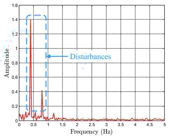 To obtain the cutoff frequency of the weighting functions, we adopt the following technique. First, we apply sinusoidal signal to the EHVS combined with the inverse hysteresis model for at sampling interval . Second, we obtain the fast Fourier transform of feedforward compensation error [], which is considered as an exogenous periodic disturbance, to obtain its spectrum. The amplitude spectrum of the error is shown in Figure 12 and comprises harmonics of sinusoidal signal . Third, we approximate the cutoff frequency of the weighting function as because the harmonics under are dominant when compared with other harmonics. In other words, low-frequency disturbances under influencing the closed-loop system can be rejected by the robust PID controller with weighting function using cutoff frequency of . Additionally, we set , , , and as bounds at low and high frequencies. Thus, the designed weighting functions for the sensitivity and complementary sensitivity functions are given by