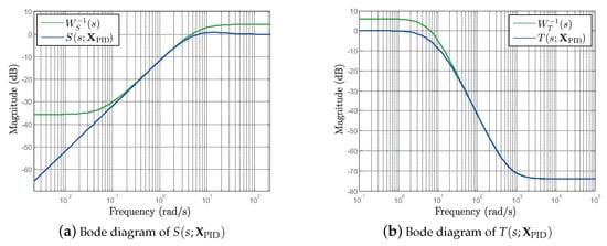 where and represent stable frequency-dependent weighting functions. The weighting function has high gain at low frequencies to reject low-frequency disturbances, whereas the weighting function has high gain at high frequencies to mitigate sensor noise. We consider the following weighting functions: