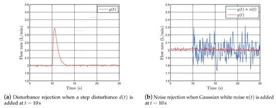 We experimentally evaluated the EHVS robustness against low-frequency disturbances and high-frequency noise using the proposed parallel control strategy. Figure 17 shows the responses obtained from the feedforward plus feedback control system in the parallel configuration shown in Figure 14b. The disturbance rejection results are shown in Figure 17a for step disturbance with magnitude and low-frequency components added at . Figure 17b shows the noise rejection results under Gaussian white noise and high-frequency components added at . These experimental results demonstrate that the proposed robust PID controller with the weighting function at cutoff frequency of can reject the influence of low-frequency disturbances and high-frequency noise.