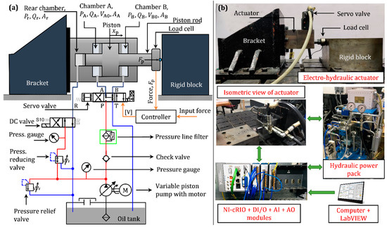 A schematic and the experimental setup of the electro-hydraulic actuator mounted on a rigid bracket is shown in Figure 1a,b, respectively. The composite design of a double-acting piston and cylinder arrangement controlled by a servo valve, and a separate rear chamber controlled by a pressure reducing valve is evident from the schematic in Figure 1a. The piston applies force against a rigid block. The block and the bracket (on which the actuator is mounted) are rigidly secured to a rigid bed to minimize the influence of boundary conditions.