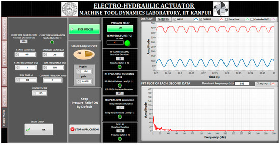 - Control software: NI LabVIEW is used as the control software to monitor and to control the electro-hydraulic actuator. The LabVIEW program is divided into three subprograms to increase computational efficiency. These are: the FPGA (Field Programmable Gate array) layer which includes data acquisition and a proportional-integral (PI) controller–that is used in the closed-loop control of the actuator as detailed in Section 6; the RT (Real-Time) layer that displays time and frequency content of signals; and the Host layer that can generate any user-defined signal as necessary. The host layer also logs all signals of interest. The software layer also consists of a graphical user interface (GUI) as shown in Figure 3. This GUI is used to control and to monitor the electro-hydraulic actuator.