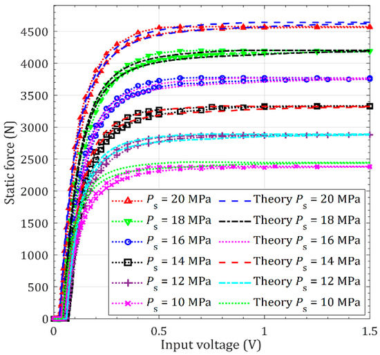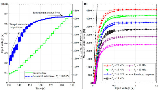 (a) Variations in static force with input voltage at a supply pressure of 18 MPa, and (b) measured force characteristics for changing levels of voltages and supply pressures compared with linear model-predicted forces changing with voltages.