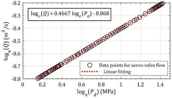The linear static model (see Equation (18)) suggests a linear relationship between the output force and the input voltage, with the flow coefficient () and the flow-pressure coefficient () contributing to the slope. These coefficients, though nonlinear (see Equation (6)), were linearized assuming that they do not change with operating conditions. However, since the static characteristics evident in Figure 4 clearly exhibit nonlinearities, the dependence of these coefficients on operating parameters must be accounted for. Since the flow coefficient depends on the spool displacements (see Equations (6)–(8)), which does not change much for static experiments, the flow coefficient can be assumed to remain constant. The flow-pressure coefficient on the other hand is a function of the load pressure. This dependence is valve specific and is usually described by valve manufacturers’ in terms of variations in the valve flow (Q) with the pressure differential () across the servo valve. In the present case, we characterize this relationship by fitting a curve to the data provided by the valve manufacturer [48]. The data and the fitted relationship in logarithmic scales are shown in Figure 5.