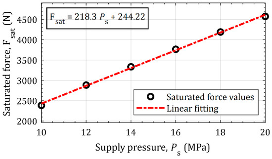 Saturation in the actuator response occurs when the load pressure achieves its limiting value of the supply pressure. Noting the linear dependence of static force () on the load pressure (), the inverse relation between the slope of curve and from the static force model presented in Section 3.2 and the hyperbolic relation between and the load pressure () as shown in Equation (23), it is easy to deduce that as the static force and hence the load pressure increases with the input voltage, so does the value of resulting in a corresponding decrease in the slope of curve. As the load pressure () converges to its limiting value of supply pressure (), the slope tends to zero and a constant force value is achieved, which is termed as the Saturated Force (). The voltage value at this saturation point is correspondingly termed as the Saturation Voltage (). Beyond the Saturation Voltage (), the static force is constant and independent of the input voltage. Hence, the net saturated force () can be expressed using the Pascal’s law as the product of the saturated load pressure () and the area of the central annulus of the piston, while also accounting for the pressure drop due to internal leakages across the piston chambers () as follows: