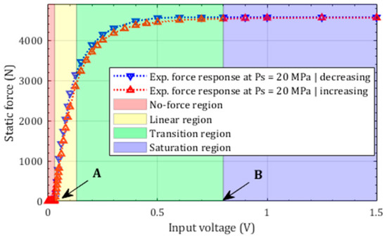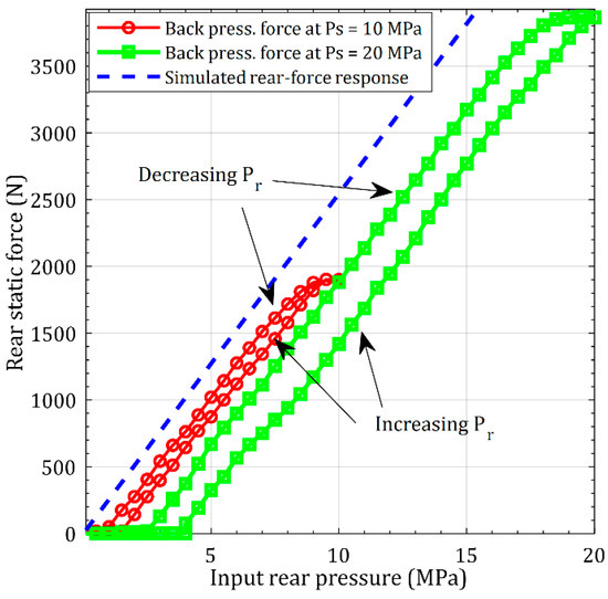 As is evident from Equation (19), this force too is linearly dependent on the pressure and on the area of the piston. These static forces obtained from controlling the servo valve and obtained from controlling pressure in the rear chamber can be superposed () to obtain higher forces, as necessary. Having described the linearized static and dynamic force models, these are contrasted with experiments in Section 4 (static characterization) and in Section 5 (dynamic characterization).
